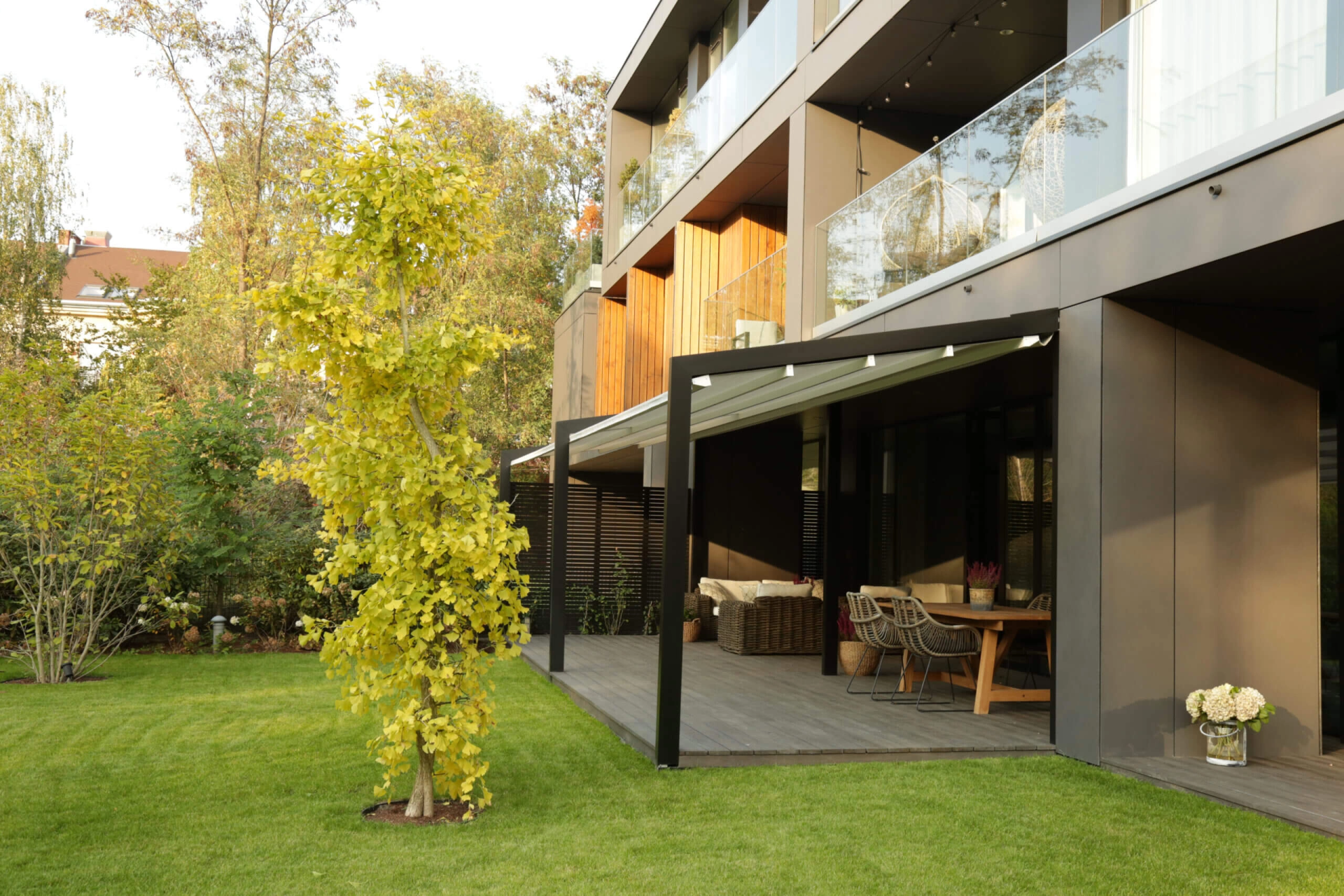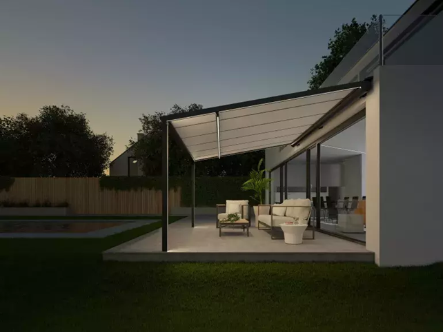 La pergola TESA con tetto scorrevole è un modello che viene sempre addossato alla casa. Il tetto retrattile in tessuto rimane sempre in tensione all’interno delle guide grazie al sistema brevettato ZIP. In questo modo può scorrere facilmente per essere avvolto o esteso, e in posizione completamente retratta garantisce un’illuminazione ottimale della casa. Inoltre, il telo della pergola è disponibile in numerose tonalità, per un perfetto abbinamento della pergola al colore della vostra casa e delle vostre finestre. Design minimalista e drenaggio agevole dell’acqua piovana. Finitura perfetta in ogni suo progetto. Ne sono un esempio le viti a scomparsa che si integrano nel telaio della pergola e l’ingegnoso quanto agevole sistema di scolo dell’acqua incorporato nei pali portanti della struttura. Tutto ciò, in combinazione con la forma slanciata dei pali, conferisce alla TESA un design minimalista che le permette di fondersi completamente con il giardino e a voi di godervi una vista panoramica a 360°. Adattabile alle esigenze della vostra casa. Personalizzate la pergola a vostro piacimento! Le numerose soluzioni per creare un’illuminazione d’atmosfera vi permetteranno di trascorrere piacevoli serate all’aperto. Altrimenti scegliete un’illuminazione LED dimerabile nei pali, nelle guide laterali o nella trave di supporto. È possibile integrare un volant retrattile, completamente automatico e alimentato a energia solare, che rappresenta la soluzione ideale la mattina a colazione quando il sole è basso o la sera al tramonto. I lati della copertura per esterni possono essere completamente chiusi con molti Tessuti di forma triangolare e pregevolmente rifiniti, che offrono riparo dal vento, e tessuti screen ZIP che proteggono dal sole perimetralmente.