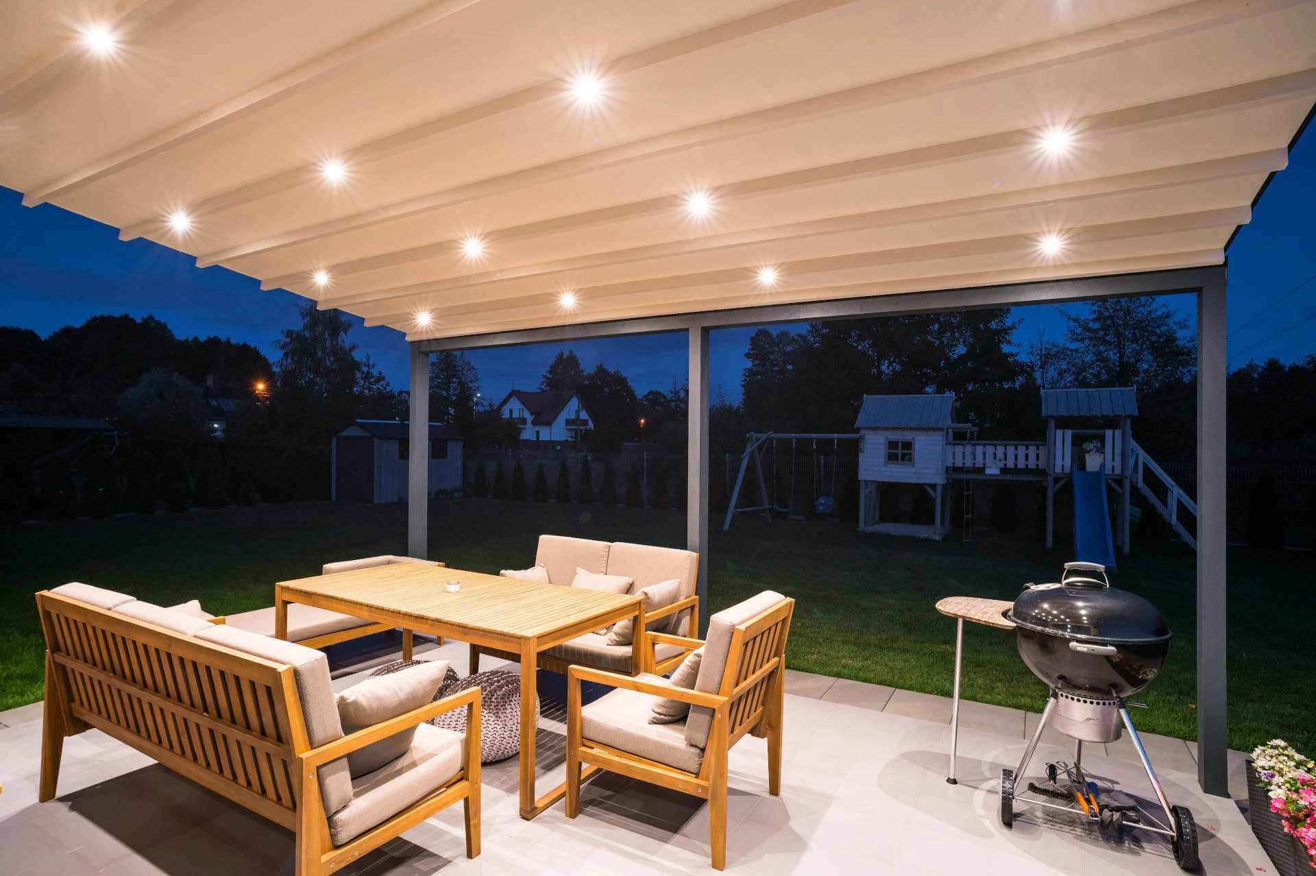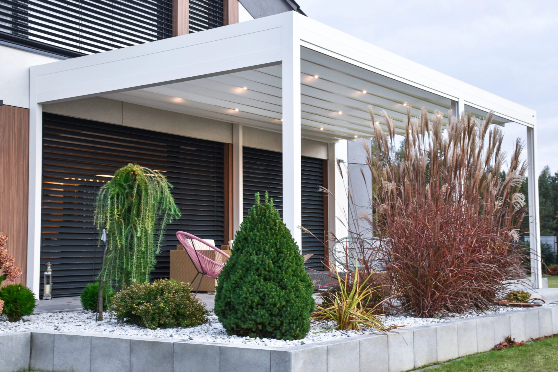 Si inserisce in qualsiasi quadro architettonico e la possibilità di modificarlo permette di realizzare una copertura affidabile in ogni condizione. Questa è la copertura più universale e più spesso scelta da CASA in&out. L’eleganza unisce semplicità e lusso e, grazie a moderne soluzioni tecnologiche, è anche facile e pratico da usare. Il tetto è realizzato in tessuto Techprotect a tre strati. La struttura è composta da una base in alluminio, un tetto inclinato pieghevole e un sistema di copertura che protegge il materiale quando viene impacchettato . Classica è un prodotto estremamente durevole e stabile, caratterizzato da un’elevata resistenza alle raffiche di vento, anche fino a 120 km/h. È resistente alla pioggia, al calore e ai raggi UV. Lo scarico dell’acqua piovana avviene attraverso un invisibile sistema di grondaia integrato alla struttura. Il prodotto è adatto all’installazione di tende a rullo, vetrate, illuminazione o radiatori di calore, il che consente qualsiasi modifica del terrazzo o giardino. Si completa con l’inserimento di chiusure perimetrali con vetrate o Tende Antivento Zip con molteplici tipi di Tessuto. Automatismi completi da radiatori di calore e illuminazione, che può essere organizzato in modo lineare sull’tetto. Funzionale dall’inizio della primavera al tardo autunno.