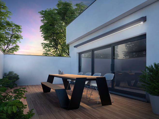 L'estensione del tessuto può essere comandata tramite smartphone o telecomando. Inoltre può essere aggiunta anche un'illuminazione a led lungo il cassonetto oppure nei bracci.
